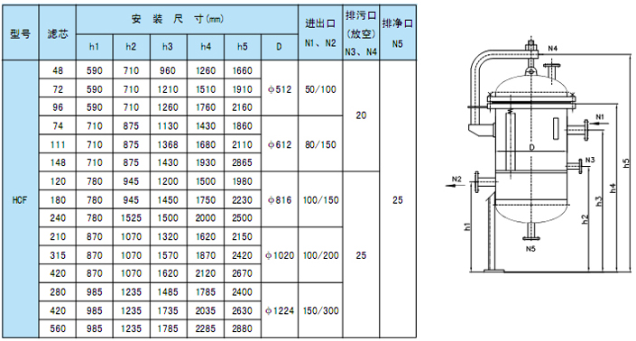 4、HCF-Ⅲ型微孔塑料滤芯精细过滤器 其滤件是由高分子量聚乙烯烧结成型。具有刚性好、重量轻、孔隙率高、可反冲洗再生、无毒、耐蚀。过滤精度0.5μm~100μm。 ●.非金属滤芯精细过滤器结构典型结构及尺寸 注:1.滤芯数指折合标准型滤芯(10”长)数目。 2.本图适用于DN≤500,由于工艺参数各不相同,因此,在订货时,我公司将按实际的工艺参数作适当修正。 注:1.滤芯数指折合标准型滤芯(10”长)数目。 2.本图适用于DN≥500,由于工艺参数各不相同,因此,在订货时,我公司将按实际的工艺参数作适当修正。
