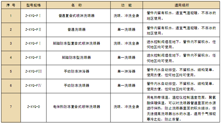 1、产品概述 Z-XYQ型系列安全事故喷淋洗眼器是使用于接触酸、碱、有机物及其它有毒、腐蚀性物质等易发生事故的场所。当发生意外伤害事故时,使用本装置进行喷淋冲洗,可将伤害减轻到最低程度,是一种安全劳动保护的必备设施。 2、产品分类、功能及选型 Z-XYQ-PⅠ型普通复合式喷淋洗眼器 1、基本功能特点 ●.带有喷啉和洗眼功能(冲洗脸部烧伤面)的普通型产品,装置中始终有水不能放空,适用于气温较暖之处。 ●.侧面进水口设有Rc11/4的内螺纹接口(或DN32.PN0.6法兰)与水源连接。 ●.顶端有一Rc11/4的内螺纹接口(或DN32.PN0.6法兰)备用进水口,当水源由上方进时,堵塞侧进水口。 ●. 当打开洗眼进水阀时,洗眼喷头自动喷水,不用时关闭进水阀门即可,使用方便。需喷淋时用手轻拉阀门拉杆,水从喷淋头自动喷出;用后须将阀门拉杆复位。 ●.在进水口处设有过滤器,确保水质清洁。 ●.由流量调节阀调节洗眼喷头喷水,确保出水柔和。